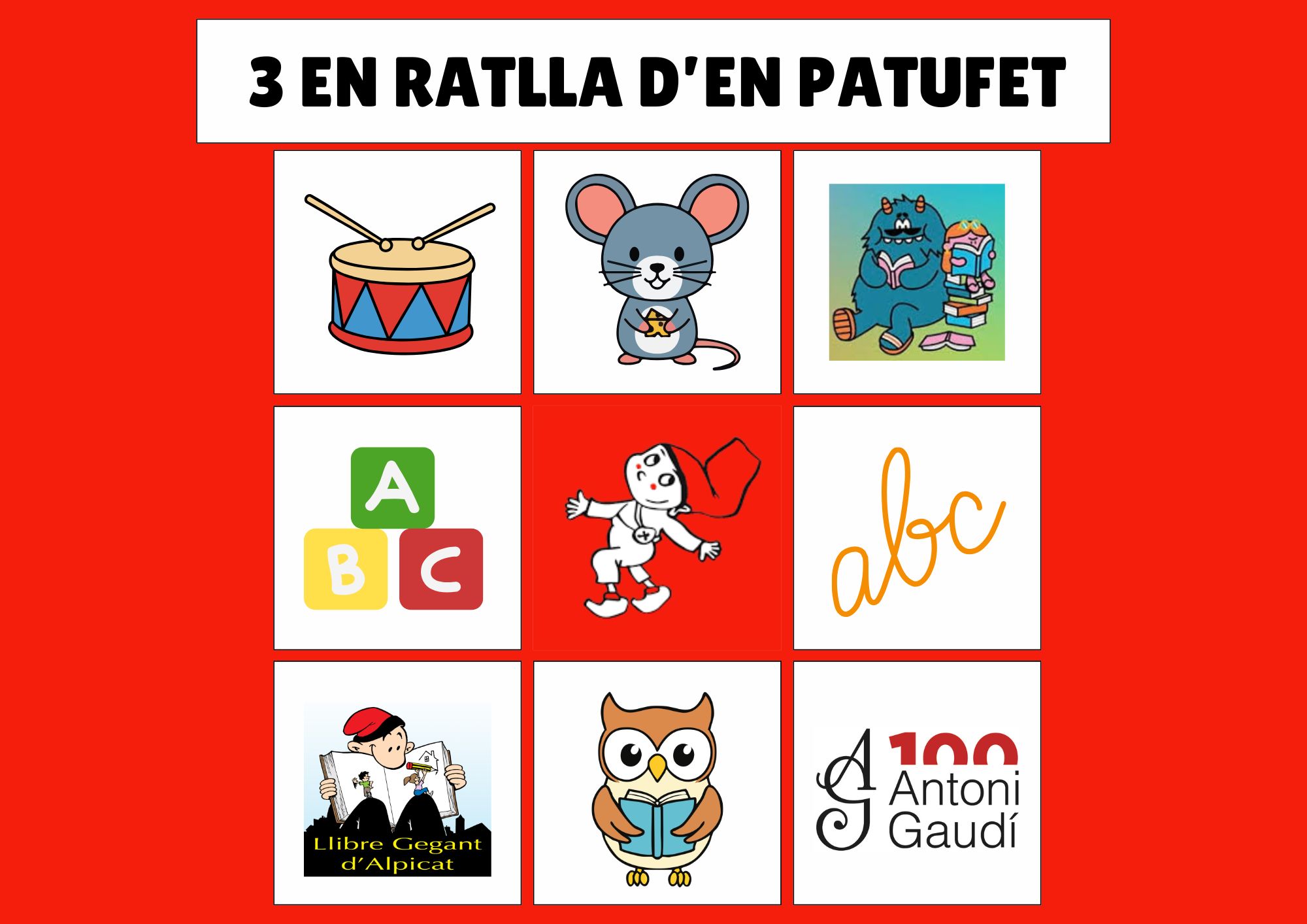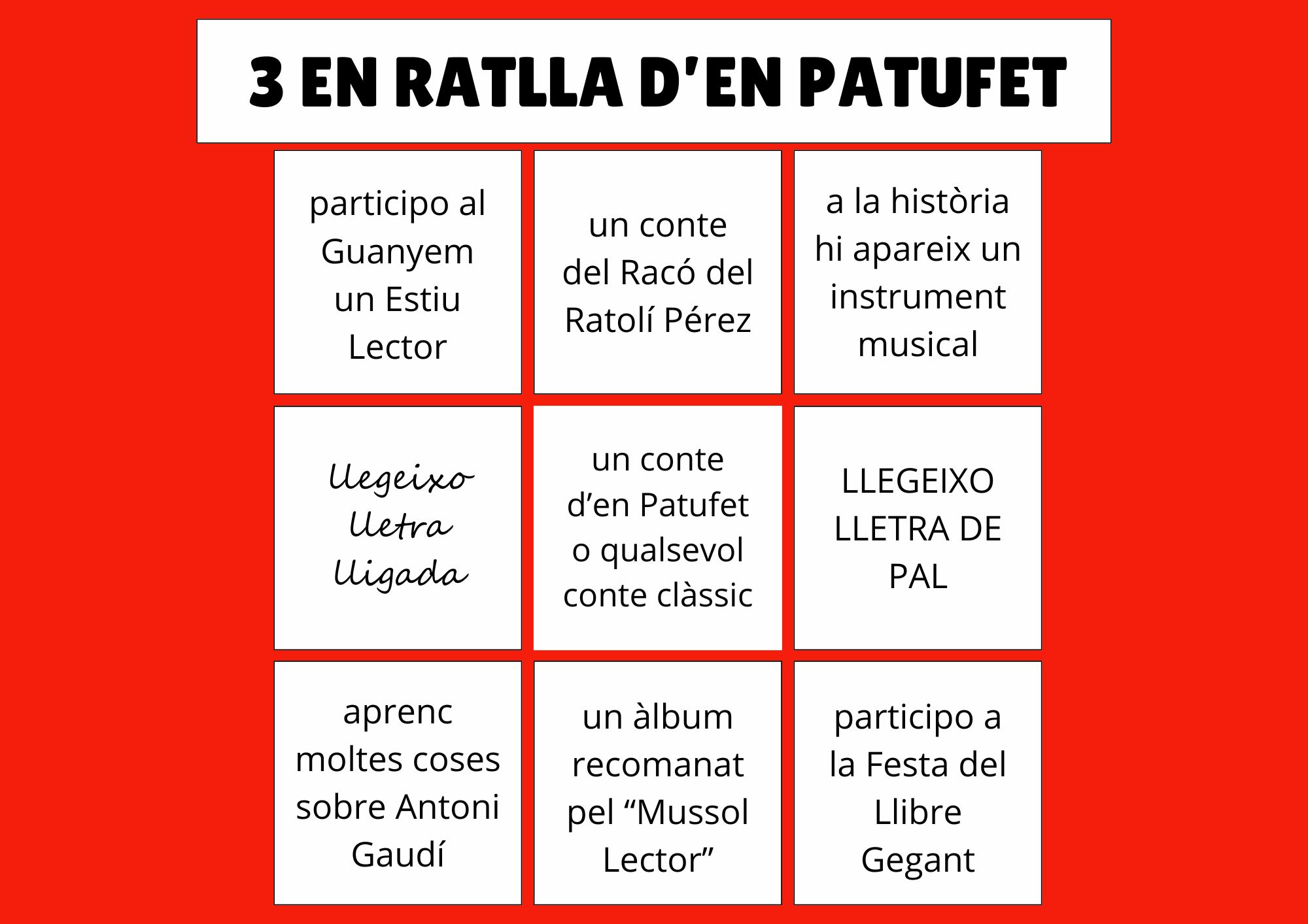 A l'àrea infantil hi trobareu una bústia del Patufet creat per la Pilarín Bayés, il·lustradora molt popular. Hem ideat una dinamització basada en el joc del 3 en ratlla. Agafeu la butlleta i participeu! L'edat recomanada seria de 5 a 10 anys.