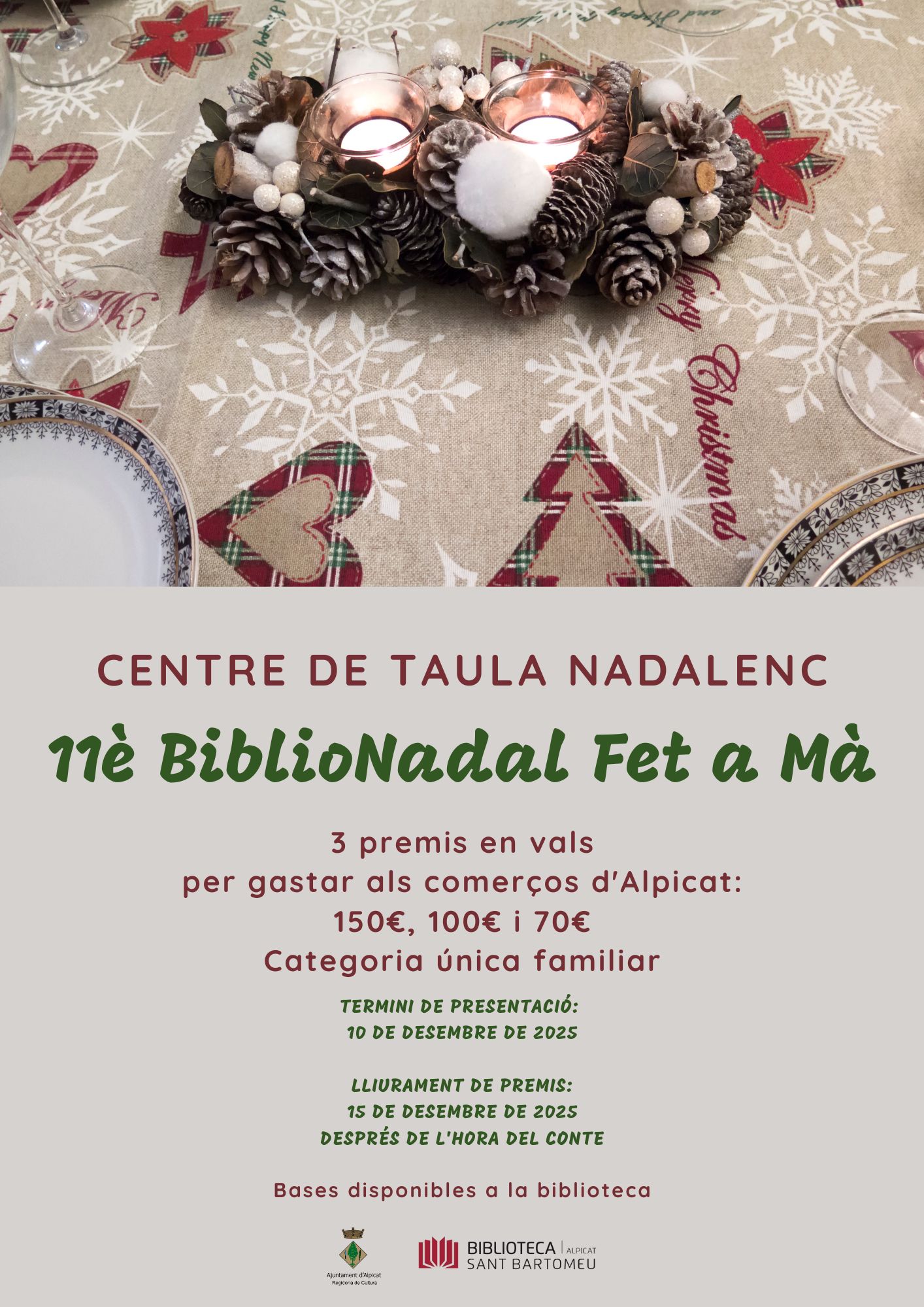 Un any més, tornem a convocar el concurs familiar de manualitats nadalenques, amb el propòsit d'apropar la biblioteca a tota la família i donar a conèixer els nostres espais i serveis: hi ha qui hi accedeix per primer cop per admirar els treballs presentats. El concurs BiblioNadal Fet a Mà 2025 proposa la creació de centres de taula, que podreu aprofitar per guarnir els vostres dinars i sopars de Nadal.
